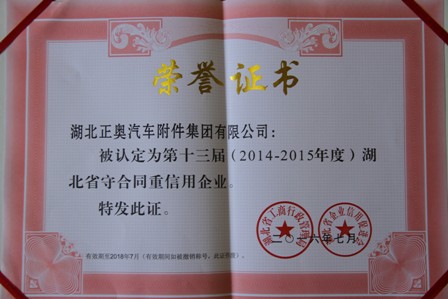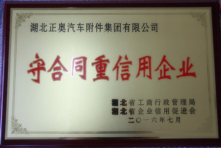 湖北正奧汽車附件集團(tuán)有限公司榮獲2014--2015年度省級 “守合同重信用企業(yè)”榮譽(yù)稱號,此次評選省級“守合同重信用企業(yè)”是由湖北省工商行政管理局和湖北省行業(yè)信用促進(jìn)會聯(lián)合評選并授予,此次獲獎也是我公司連續(xù)多年獲得“守合同重信用企業(yè)”稱號。